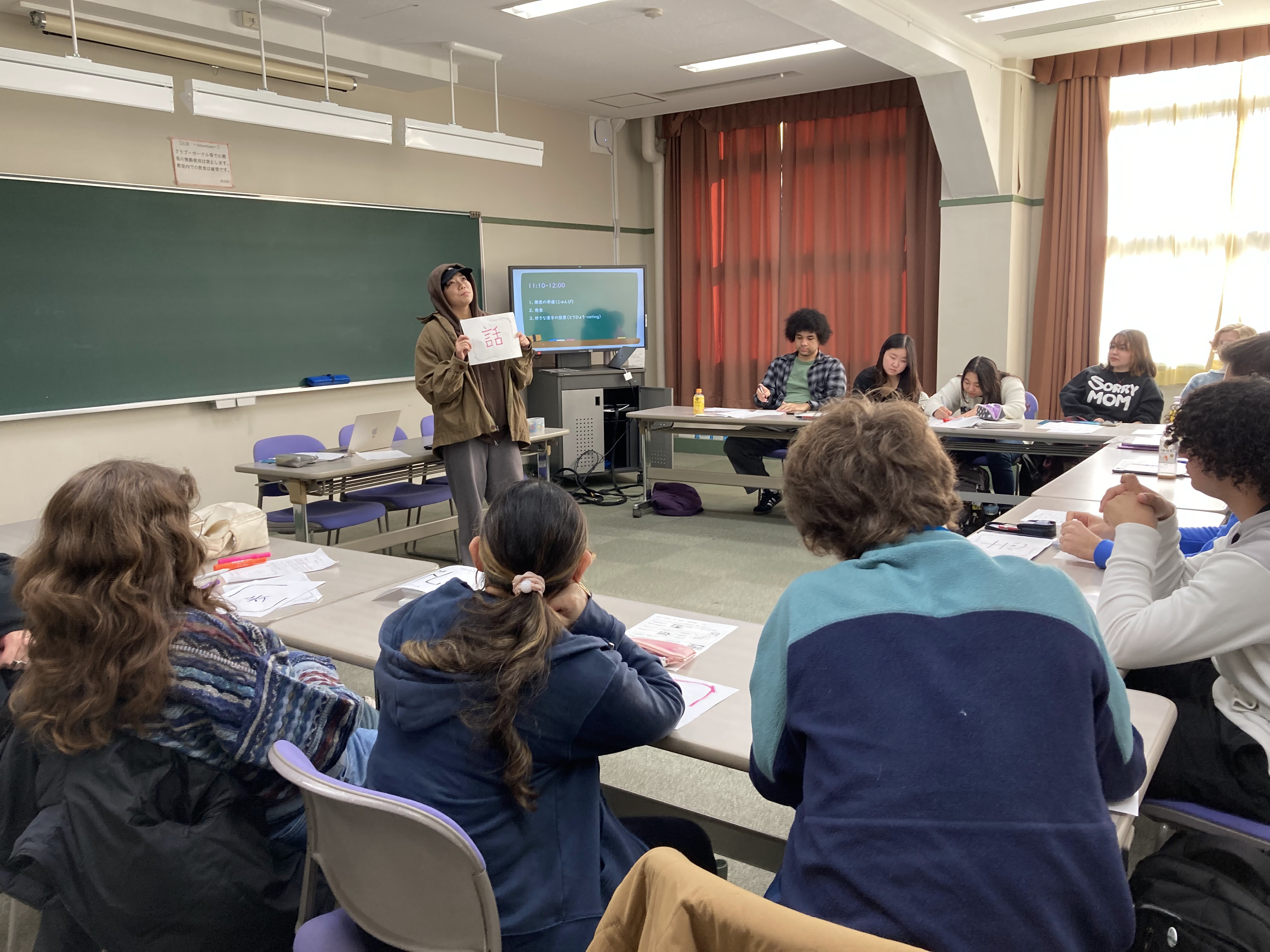 漢字語彙を勉強する「ぐんぐん増やそう」AクラスとBクラスは、合同で「今学期の漢字」の発表会を行いました。